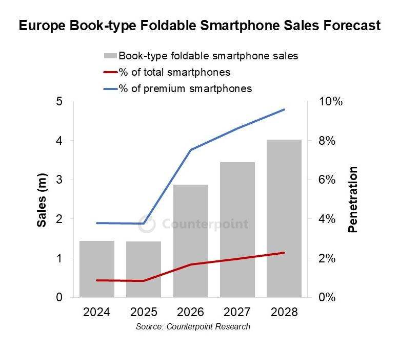 該機(jī)構(gòu)認(rèn)為 2024 年是歐洲折疊屏手機(jī)市場(chǎng)的關(guān)鍵轉(zhuǎn)折點(diǎn)。盡管該品類(lèi)整體仍?xún)H占智能手機(jī)總銷(xiāo)量約 2%,但全年出貨量同比增長(zhǎng) 37%,其中書(shū)本式折疊手機(jī)增長(zhǎng)高達(dá) 60%。
