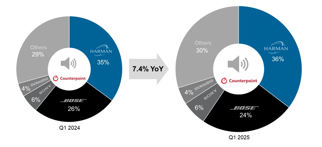Counterpoint:Harman 和 Bose 以近 60% 的全球銷量份額領(lǐng)跑汽車音響系統(tǒng)市場