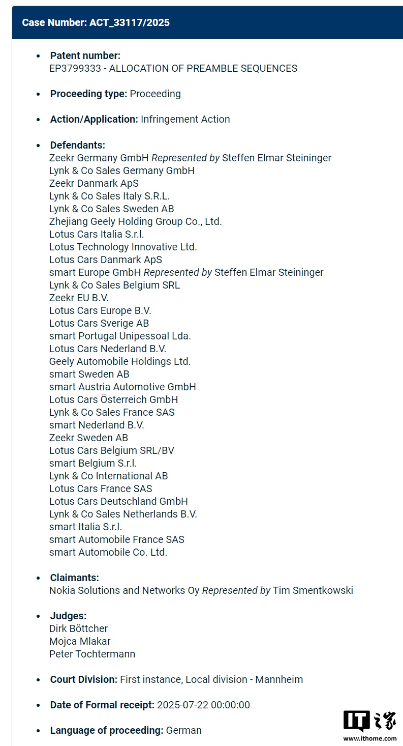 8 月 15 日消息,據(jù)海外知識(shí)產(chǎn)權(quán)媒體 IP Fray 上周報(bào)道,諾基亞已對(duì)吉利集團(tuán)及其旗下四大品牌 —— 極氪、領(lǐng)克、路特斯及 Smart—— 發(fā)起專利侵權(quán)訴訟,波及吉利在歐洲 18 個(gè)國家的 32 家分公司。