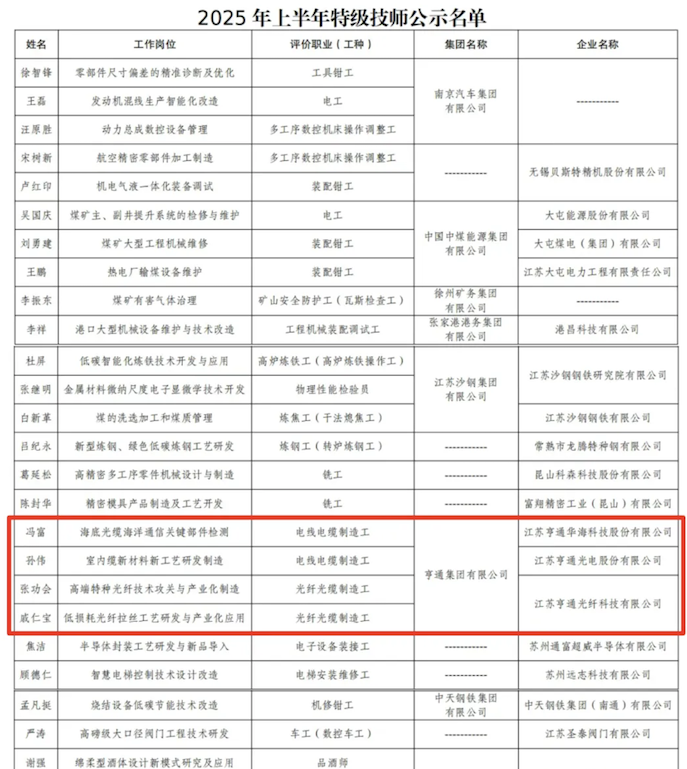 日前,江蘇省人社廳發(fā)布的2025年上半年特級技師名單公示結(jié)束,亨通集團(tuán)旗下三家企業(yè)4人成功獲評特級技師。至此,亨通已累計有16人獲評該職稱。這一亮眼成績,是亨通深耕技能人才培養(yǎng)結(jié)出的又一碩果,更是企業(yè)長期將人才戰(zhàn)略置于核心地位的生動寫照。
