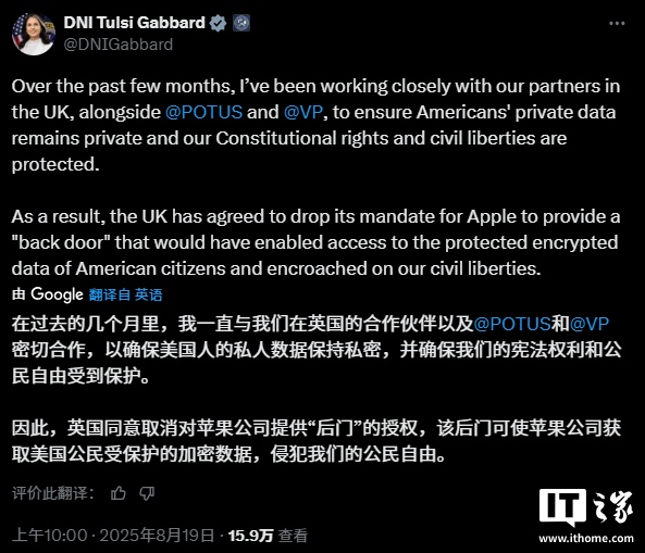 8 月 19 日消息,美國國家情報(bào)總監(jiān)圖爾西・加巴德(Tulsi Gabbard)于本周一表示,英國已同意放棄要求蘋果公司為其提供“后門”訪問權(quán)限的強(qiáng)制要求,該“后門”原本旨在使美國公民受保護(hù)的加密數(shù)據(jù)能夠被訪問。