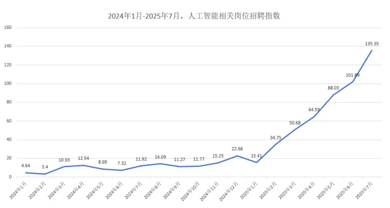 2025 年下半年以來(lái),AI 行業(yè)的人才爭(zhēng)奪戰(zhàn)已進(jìn)入白熱化階段。職場(chǎng)社交招聘平臺(tái)脈脈 8 月 19 日發(fā)布的統(tǒng)計(jì)數(shù)據(jù),用一組組飆升的數(shù)字,直觀(guān)揭示了這場(chǎng) “搶人潮” 的激烈程度 —— 崗位量暴漲、薪資水漲船高、從業(yè)者跳槽意愿強(qiáng)烈,全行業(yè)對(duì) AI 人才的渴求已突破技術(shù)領(lǐng)域,蔓延至多個(gè)崗位維度。