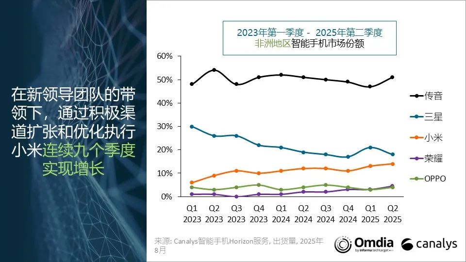 得益于在尼日利亞和埃及的強(qiáng)勁增長、積極的渠道擴(kuò)張及更深入的本地投資,小米同比增長 32%,以 14% 的份額奪得第三。