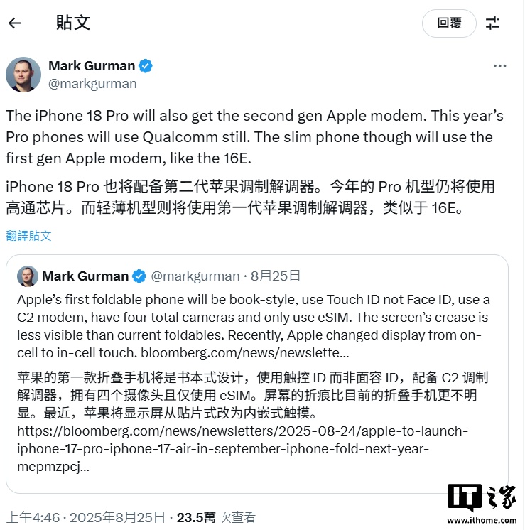 彭博社記者古爾曼昨天在 X 平臺透露,蘋果 iPhone18 Pro 將配備蘋果自研的第二代基帶。