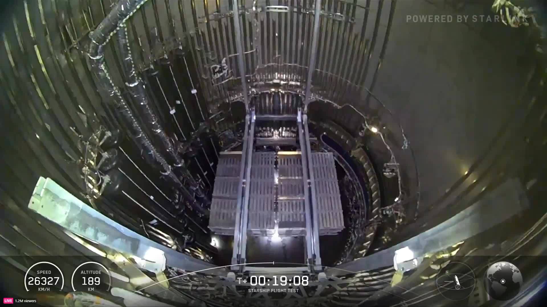 隨后,作為今天 SpaceX 星艦試飛的一個(gè)重要里程碑事件,SpaceX 的飛船上面級成功部署了 8 個(gè)星鏈衛(wèi)星模擬器。這些衛(wèi)星呈扁平堆疊狀,部署速度約為每分鐘一個(gè)。此次釋放的軌道為亞軌道,模擬載荷在不久后返回地球。SpaceX 希望使用星艦作為主力運(yùn)載火箭,每次發(fā)射一批 60 顆星鏈 3.0 版互聯(lián)網(wǎng)衛(wèi)星。