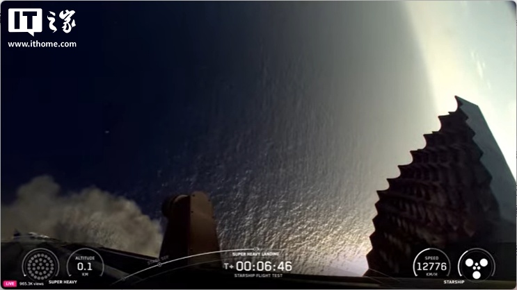 之后,星艦超重型助推器通過一次熱分離與星艦上面級分離,成功在墨西哥灣實(shí)現(xiàn)軟著陸和濺落。這款擁有 33 臺發(fā)動機(jī)的火箭在發(fā)射過程中損失了一臺發(fā)動機(jī),但這似乎并未影響其飛行或著陸。