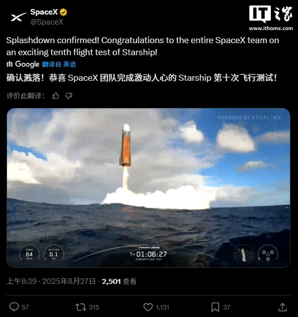 8 月 27 日消息,連續(xù)兩天推遲發(fā)射后,SpaceX 新一代重型運(yùn)載火箭“星艦”于美國中部時(shí)間 8 月 26 日 18 時(shí) 30 分從得克薩斯州發(fā)射升空,實(shí)施第十次試飛。此次任務(wù)重點(diǎn)目標(biāo)包括讓飛船部署模擬衛(wèi)星、在太空中進(jìn)行發(fā)動機(jī)重新點(diǎn)火測試等。按計(jì)劃,火箭助推器將落入墨西哥灣區(qū)域,不返回發(fā)射場。