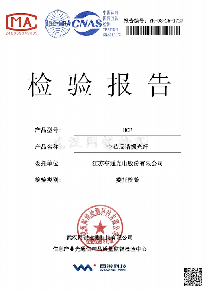 其中,亨通光電空芯反諧振光纖已通過網(wǎng)銳科技(信息產(chǎn)業(yè)光通信產(chǎn)品質(zhì)量監(jiān)督檢驗中心)檢驗,檢測結(jié)果各項指標(biāo)性能合格。