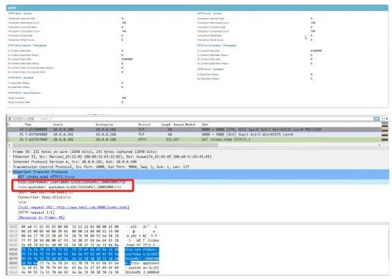 • 儀表統(tǒng)計顯示所有業(yè)務會話均建立成功,抓包顯示http報文攜帶正確的令牌