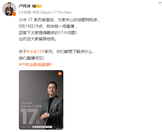 小米集團(tuán)合伙人、總裁,手機(jī)部總裁,小米品牌總經(jīng)理盧偉冰今天下午宣布,自己將在9月19日19時(shí)開(kāi)啟一場(chǎng)直播,回答關(guān)于小米17系列“大家提得最多的 17 個(gè)問(wèn)題”。