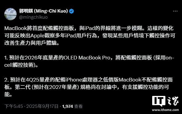郭明錤:預(yù)計明年底量產(chǎn)的 OLED 蘋果 MacBook Pro 將采用觸控屏