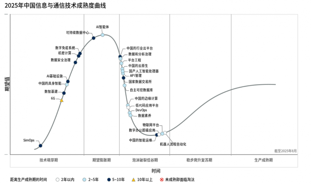 IT行業(yè)的技術(shù)更迭是無(wú)法忽視的,CIO不僅希望通過(guò)“平衡游戲”來(lái)貢獻(xiàn)業(yè)務(wù)價(jià)值,也希望理解技術(shù)相關(guān)發(fā)展的最新動(dòng)態(tài)。在此次成熟度曲線報(bào)告中,部分技術(shù)因?yàn)檫^(guò)時(shí)而被移除,或是被新技術(shù)所取代。其中比較明顯的案例便是5G被6G取代、生成式AI被AI智能體取代、工業(yè)互聯(lián)網(wǎng)被物聯(lián)網(wǎng)平臺(tái)取代。同時(shí),像是去年中還存在的“數(shù)據(jù)中臺(tái)”因?yàn)楸徽J(rèn)為過(guò)時(shí)而移除,但在曲線中放入了新的“數(shù)智基建”。而像“軟件定義廣域網(wǎng)”“混合云計(jì)算”已經(jīng)不再是CIO的優(yōu)先事項(xiàng),現(xiàn)已變?yōu)榛A(chǔ)設(shè)施經(jīng)理需要關(guān)注的技術(shù),所以也在曲線中進(jìn)行了移除,也減輕了CIO的負(fù)擔(dān)。