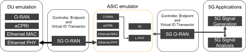 為實現(xiàn)硅前測試目標(biāo),必須預(yù)先驗證測試套件,以避免耗費時間調(diào)試測試用例本身。測試設(shè)置的可觀察性對早期發(fā)現(xiàn)和解決問題有關(guān)鍵意義,能有效防止?jié)撛谌毕荼贿z留到最終的設(shè)計。圖2展示了用于ASIC仿真的O-RU測試協(xié)議棧和控制器測試設(shè)置。