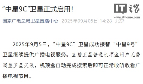 9 月 5 日消息,國家廣播電視總局宣布,“中星 9C”衛(wèi)星今日正式接替服役多年的“中星 9 號”衛(wèi)星,繼續(xù)為全國用戶提供廣播電視服務,用戶無需調整設備即可正常接收信號。