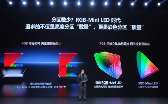 近年來,高端電視市場陷入單純堆砌分區(qū)數(shù)量的內(nèi)卷誤區(qū),一些廠商執(zhí)著于分區(qū)數(shù)比拼,卻忽視了光源、控光等顯示技術(shù)的本質(zhì)迭代。當(dāng)前無論是QD-Mini LED還是SQD-Mini LED技術(shù),本質(zhì)都是單色背光+量子點(diǎn)Mini LED方案,依賴藍(lán)光+量子點(diǎn)膜完成色彩轉(zhuǎn)換,光線需經(jīng)過量子點(diǎn)膜、濾光片等多重介質(zhì),不僅光能量損耗多造成功耗較RGB-Mini LED高出50%,同時(shí)高亮場景下更易出現(xiàn)色彩沖淡、畫面泛白等問題,直接影響視覺體驗(yàn)。