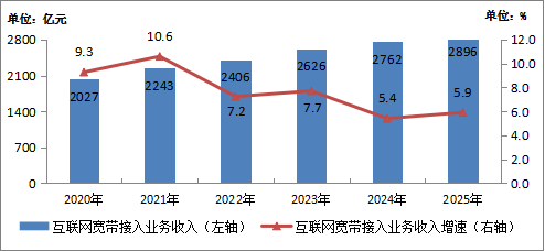 圖1-2  2020—2025年互聯(lián)網(wǎng)寬帶接入業(yè)務(wù)收入情況