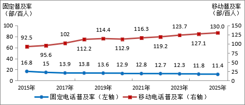 圖2-1  2015—2025年固定電話及移動(dòng)電話普及率發(fā)展情況