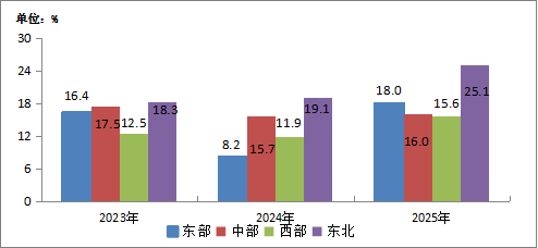 圖5-2  2023—2025年東、中、西、東北地區(qū)移動(dòng)互聯(lián)網(wǎng)接入流量增速情況