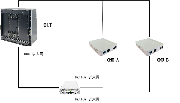 本次測試以 “1 臺 OLT 下掛 2 臺 ONU” 為典型場景,共占用 3 個測試儀端口:2 個 10G 端口連接 ONU,1 個 100G 端口連接 OLT。