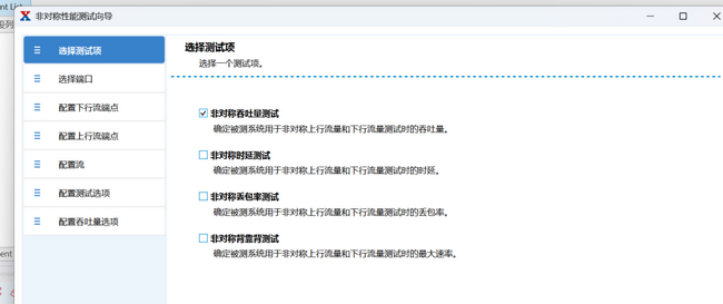 測試向?qū)峁┧念悳y試選項,本次重點選擇 “非對稱吞吐量測試”(測試結(jié)果將同步統(tǒng)計吞吐量、時延及抖動數(shù)據(jù)),其余選項可根據(jù)需求靈活勾選: