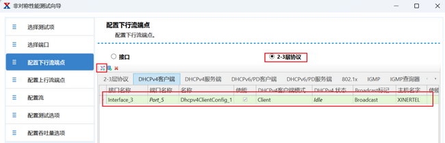 在這里也可以設置L23協(xié)議接口,例如DHCPv4,模擬用戶PC獲得DHCPv4地址后使用DHCPv4地址作為端點(IPv6/雙棧用戶都支持)。大多數(shù)情況下,上行流端點是模擬下掛在ONU用戶側(cè)的PC,這個方向使用DHCPv4/v6接口或雙棧。下行流端點模擬的OLT上聯(lián)設備,這個方向一般使用V4/V6接口。