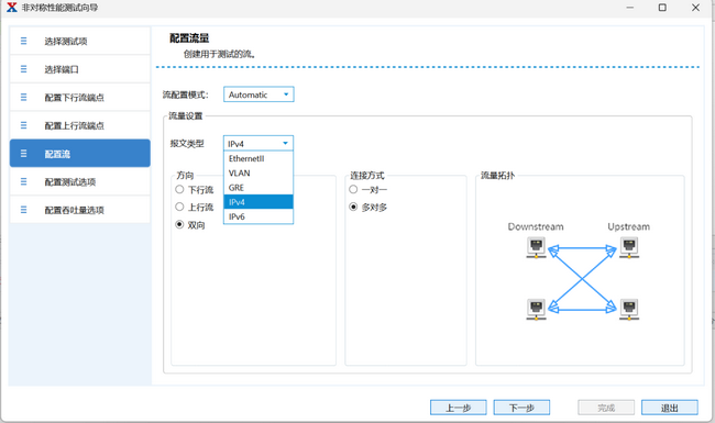 Automatic(自動模式):根據(jù)報文類型(IPv4/IPv6/EthernetII/VLAN/GRE 等)、流量方向(上行 / 下行 / 雙向)及連接方式,自動創(chuàng)建測試流量,支持一對一、多對多等流量拓撲。