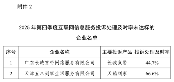 在互聯(lián)網(wǎng)信息服務(wù)投訴方面,2025年第四季度,互聯(lián)網(wǎng)信息服務(wù)投訴平臺收到的互聯(lián)網(wǎng)用戶投訴中,服務(wù)功能類投訴占比46.2%,個人信息保護類投訴占比18.6%,客服渠道類投訴占比15.5%。在178家頭部互聯(lián)網(wǎng)企業(yè)中,廣東長城寬帶、天鵝到家等2家企業(yè)投訴處理及時率較低,已督促相關(guān)企業(yè)妥善處理用戶反映的問題。