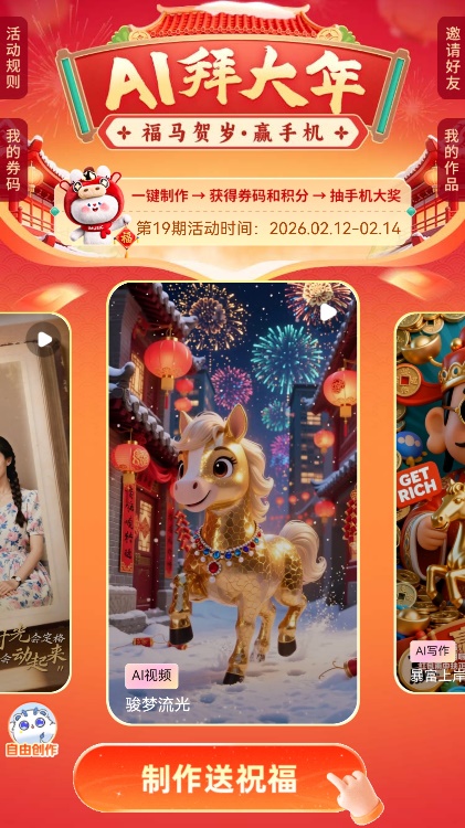 打開小程序,春節(jié)氛圍撲面而來(lái)!鞍朔絹(lái)財(cái)”“馬上大吉”“馬上轉(zhuǎn)運(yùn)”……的吉祥話、“卡通拜年合家歡”“Horse(好事)成雙”的拜年場(chǎng)景……一片紅紅火火。