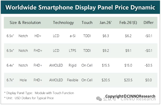 CINNO Research:淡季疊加成本高企,2 月手機(jī)面板價(jià)格全線下行