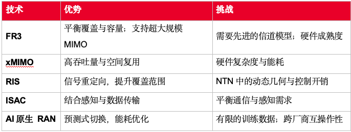 這些技術(shù)共同構(gòu)成了智能化、自適應(yīng)、由NTN賦能的6G生態(tài)系統(tǒng)的基石。不過,每項(xiàng)技術(shù)也都具備其獨(dú)特優(yōu)勢(shì)與挑戰(zhàn)(見表1)。