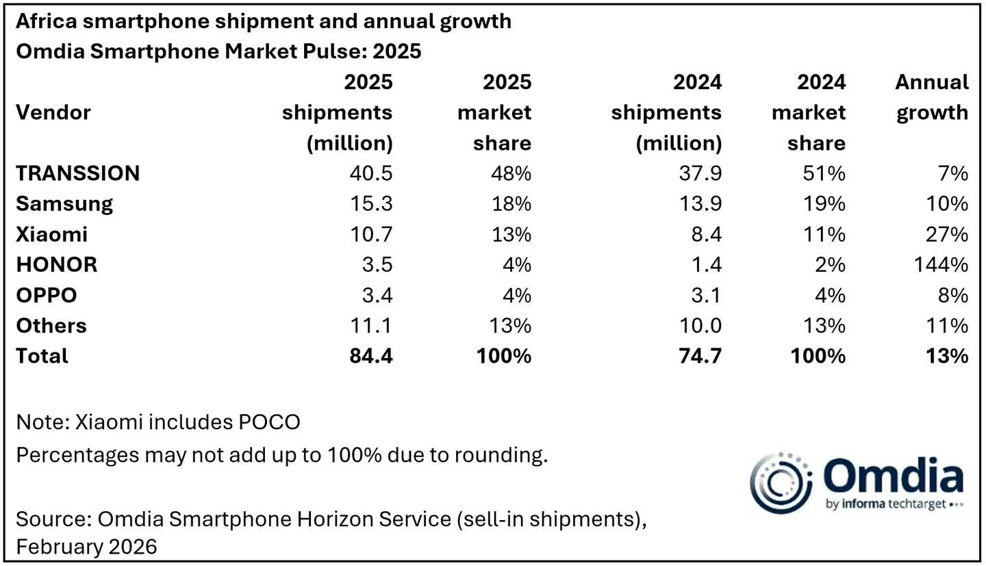 Omdia 報告顯示 2025 年非洲智能手機市場增長強勁:傳音市占率 48% 遙遙領先,三星小米榮耀 OPPO 緊隨其后