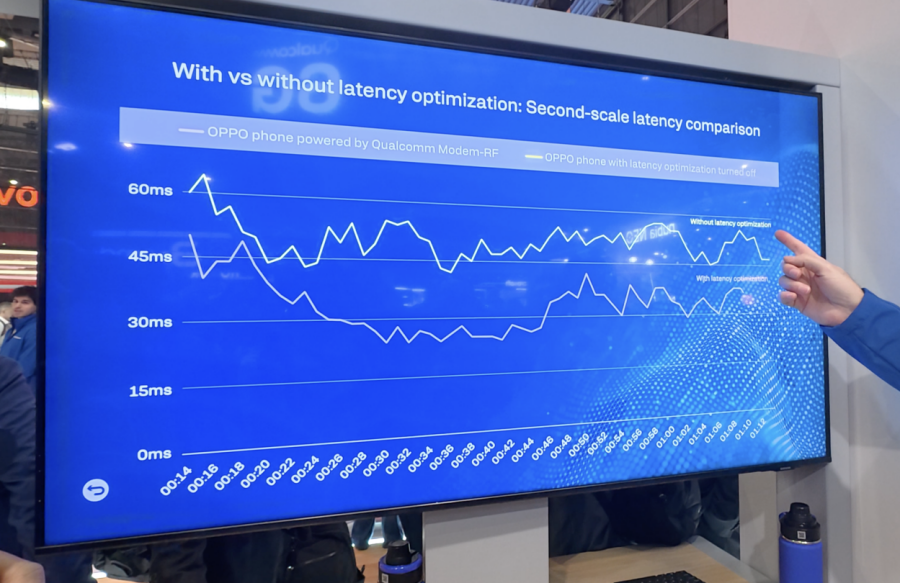 OPPO手機演示了一個很多年輕人經常觸及的案例:在人流密集的商場咖啡廳里來上一局電子競技游戲。高通的調制解調器及射頻系統(tǒng)由于能夠利用智能數據服務識別特定游戲數據流,從而進行底層加速,降低游戲平均時延,并且優(yōu)化副卡的信號,減少其對主卡連接的干擾。對比測試顯示,在相同網絡條件下,搭載高通調制解調器及射頻系統(tǒng)的OPPO手機在開啟時延優(yōu)化后,可將平均時延降低25%。這意味著,通過AI賦能的高通5G調制解調器,即便玩家處于激烈對戰(zhàn)中或執(zhí)行關鍵操作動作時,網絡連接也不太可能因其他應用或后臺進程而受到干擾。