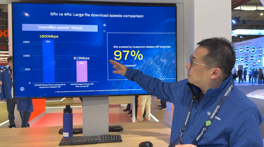 高通展臺的演示專門挑選了幾個日常生活中常見的信號不佳環(huán)境進行對比測試。相比傳統(tǒng)4Rx,開啟6Rx功能的同款機型,在封閉會議室場景下的文件下載測試中速率提升達97%;在走廊信號死角場景下總計180秒的測試時長中,觀看直播時的卡頓時長減少60%,卡頓率減少34.39%。
